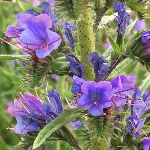 Viper’s Bugloss Echium vulgare – Known as Viper’s Bugloss, Blueweed, Snake Flower and Blue Devil. It is a Biannual. The pollen is blue but the filaments of the stamens remain red, contrasting against the blue flowers. It flowers between May/June and September. Also likes Chalky soil or dry grassland.